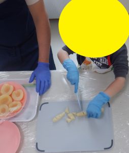 パイン味、みかん味、カルピス味、メロンソーダ味、ぶどう味、もも味と沢山の種類を用意すべく、パインやみかんを一口大に切ったり、それぞれの味に別けて寒天を入れ混ぜる工程等、子ども達みんなで頑張りました![]()