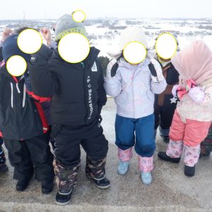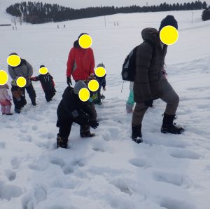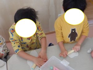 午前中は室内で粘土や塗り絵をして過ごし、午後から雪遊びにでかけました。