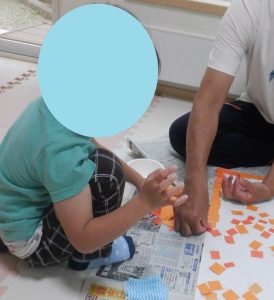 みんなで楽しく、模造紙に事前に用意した色画用紙をぺったんぺったんしましたよ✌️