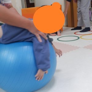 バランスボール乗りスタッフがグリグリ落ちないよう揺らして身体を動かしています🏃