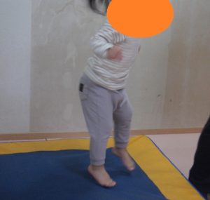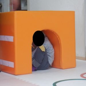 ケンケンパ、をしてからトンネルをくぐりブロック山をのぼり、トランポリンジャンプの後