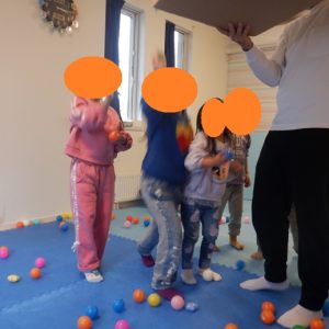 スタッフがかごを持ち走り、カラーボール🥎をかごにガンガン入投げ入れゲームを